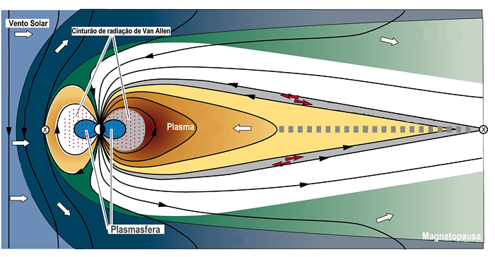 A magnetosfera protege a superfície da Terra das partículas carregadas do vento solar. É comprimida no lado diurno (Sol) devido à força das partículas chegantes, e estendido no lado noturno. Imagem: http://www.space.com/