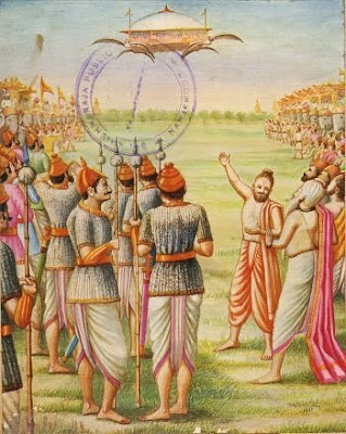 "Uma carruagem aérea, o Pushpaka, transmite muitas pessoas para a capital de Ayodhya. O céu está cheio de máquinas de vôo estupendas, escuro como a noite, mas escolhido por luzes com um brilho amarelado"